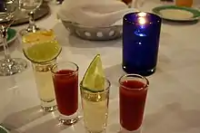 La sangrita, dont l'origine date des années 1920, est une boisson non alcoolisée servie en accompagnement d'un shot de tequila blanco.