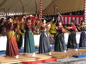 - Au printemps, depuis la fin du XVIIe siècle, a lieu un concours de tir à l'arc rassemblant les meilleurs archers du Japon. Pendant 24 heures, chaque archer doit tirer le maximum de flèches sur des cibles éloignées d'environ 60 m.