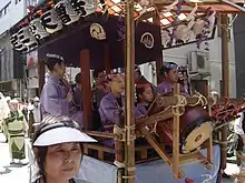 À chaque passage des châsses, de nombreuses personnes entourent ces derniers. Les mikoshi sont portés de manière énergique. Cette action est censée intensifier la puissance du kami qui se trouve dans l’autel et permet ainsi d’accorder la chance à ceux qui se trouvent à proximité. Des porteurs agitent des branches de cléyère sacrée, le sakaki et récitent des prières, on se purifie ainsi des salissures du monde terrestre. Il est coutume de voir une personne se poster sur le mikoshi criant pour diriger les personnes portant la châsse. En dehors des trois mikoshi, il y en a approximativement une centaine d’autres plus petits qui défilent le samedi. Ce sont principalement des femmes et des enfants qui se chargent de les porter.
