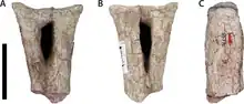 Chevron de Sanpasaurus en vue antérieure (A), en vue postérieure (B) et en vue latérale (C), avec une barre noire de 5 cm pour l'échelle.