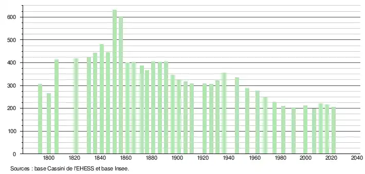 L'évolution du nombre d'habitants est connue à travers les recensements de la population effectués dans la commune depuis 1793. Pour les communes de moins de 10 000 habitants, une enquête de recensement portant sur toute la population est réalisée tous les cinq ans, les populations légales des années intermédiaires étant quant à elles estimées par interpolation ou extrapolation[13]. Pour la commune, le premier recensement exhaustif entrant dans le cadre du nouveau dispositif a été réalisé en 2006[14].