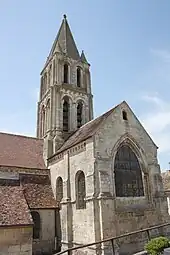 - La nef ne mesure que 3,5 m de largeur à l'intérieur et présente à l'intérieur une élévation sur trois niveaux, inspirée encore du style gothique primitif de la seconde moitié du XIIe siècle. Les arcades donnant sur les bas-côtés reposent sur de gros piliers cylindriques isolés ; les arcades du triforium longtemps bouchées s'ouvrent directement sur les combles des bas-côtés ; et des fenêtres hautes en tiers-point, sans remplage, laissent entrer le jour. Depuis la façade occidentale, une rosace entourée d'une succession de trois tores et de deux rangs de feuilles d'acanthe éclaire la nef. La façade occidentale subsiste du milieu du XIIe siècle et présente un portail à la triple archivolte en cintre brisé, avec des chapiteaux sculptés en feuillages divers. La tourelle d'escalier à gauche de la façade a été ajoutée au XIIIe siècle. Les baies des bas-côtés ont été repercées à l'époque moderne, et celles aux extrémités nord et sud du transept dès le XIIIe siècle. Les croisillons gardent toutefois sur leurs murs latéraux les baies plein cintre de l'époque romane. Comme particularité, les croisillons se prolongent vers l'est par des petites chapelles basses, dont celle au sud a perdu son caractère lors d'un remaniement. Le chœur s'ouvre sur le transept par un arc triomphal en tiers-point qui est d'origine. Le mur méridional du chœur ne date que du XVIIIe siècle, et la grande verrière du chevet a été établie au XIVe siècle quand le mur oriental a également été rebâti. Reste à signaler un portail roman bouché à l'ouest du croisillon sud, faisant face à un portail en anse de panier richement sculpté du XVe siècle, dans la troisième travée du bas-côté sud. Quant au clocher particulièrement gracieux, il remonte aux origines de l'église et se compose de deux étages ajourés de deux baies plein cintre par niveau et par face, ainsi que d'une flèche octogonale en pierre assortie de quatre cônes aux extrémités. Les angles du clocher sont occupés par des colonnes enserrées entre les contreforts, et jusqu'au premier étage, ces derniers prennent eux-mêmes la forme de colonnes. Les baies assez étroites sont précédées par des archivoltes beaucoup plus généreuses, dont les colonnes sont garnies de chapiteaux de différents types. Au premier étage, les ouvertures elles-mêmes sont également cantonnées de colonnes à chapiteaux et les archivoltes se partagent une seule colonne centrale, ce qui n'est pas le cas au second étage, où les archivoltes sont légèrement espacées et les baies dépourvues de colonnes[30],[31].