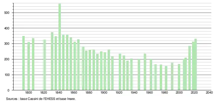 L'évolution du nombre d'habitants est connue à travers les recensements de la population effectués dans la commune depuis 1793. Pour les communes de moins de 10 000 habitants, une enquête de recensement portant sur toute la population est réalisée tous les cinq ans, les populations légales des années intermédiaires étant quant à elles estimées par interpolation ou extrapolation[16]. Pour la commune, le premier recensement exhaustif entrant dans le cadre du nouveau dispositif a été réalisé en 2008[17].
