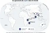 On trouve des gisements de saphirs bleus dans de nombreux pays. Ainsi, les États-Unis et le Canada possèdent notamment quelques gisements où l'on trouve le corindon bleu. Cependant, à l'état natif, cette pierre est majoritairement présente dans les zones tropicales humides. On la trouve surtout à Madagascar (gisement d'Ilakaka), au Sri Lanka et en Birmanie mais également en Chine, en Inde, au Brésil, en Thaïlande et en Afrique. La majorité des pierres trouvées au Sri Lanka sont des geudas qui ont peu de valeur à l'état naturel, mais peuvent égaler en prix les saphirs les plus chers après un traitement thermique.