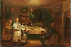 Réalisé entre 1760 et 1770 dans la région de Darmstadt, le tableau du peintre allemand Nikolaus Hoffman (1740-c.1823)[15] intitulé Weihnachtsbescherung (« Cadeaux de Noël») constitue l'un des premiers exemples répertorié figurant la coutume du sapin de Noël décoré et de la célébration de Noël en tant que fête familiale domestique à tendance profane, avec des cadeaux pour les enfants qui sont le centre de la fête[16].