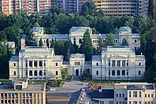 Sur le plan architectural, de nombreux bâtiments publics changent le visage de la ville, comme le bâtiment du gouvernement de Bosnie, construit en 1884 et 1885 sur des plans de l'architecte Josip Vancaš, l'hôtel de ville, construit par Alexander Wittek à partir de 1892, le théâtre national, conçu par Karel Pařík en 1897-1899, la poste centrale, construite par l'architecte Josip Vancaš entre 1907 et 1909, ou les bâtiments actuels du musée national, conçus par Karel Pařík et inaugurés en 1912[10]. Parmi les édifices religieux s'élève la cathédrale du Cœur-de-Jésus, siège de l'archidiocèse de Vrhbosna, construite entre 1884 et 1889 par l'architecte Josip Vancaš[20]. En 1910, Sarajevo compte un peu moins de 52 000 habitants[réf. nécessaire].