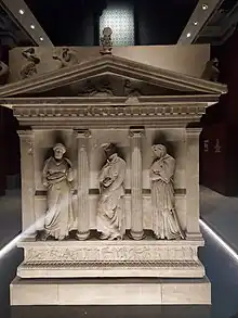Une scène funéraire figure sur la frise, au-dessus du sarcophage. C'est une composition qui peut donner une idée des coutumes de cette période. La face inférieure du sarcophage montre une autre frise, donnant à l'œuvre un élan d'élévation et de sublimation[4].