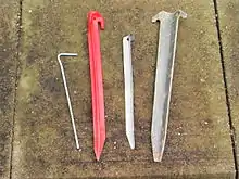 Tiges de métal terminées en crochet, pour sol ferme. Les piquets peuvent aussi être en bois. On les appelle aussi sardines.