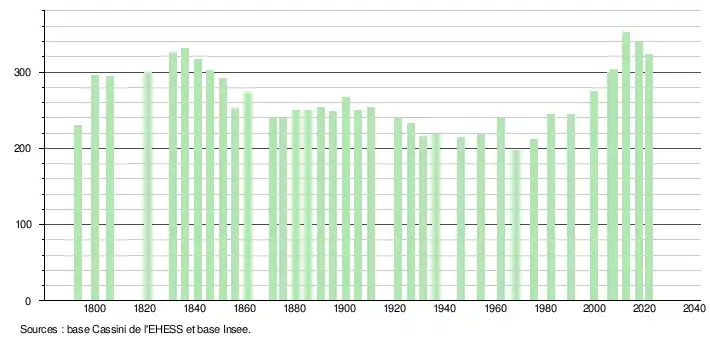 L'évolution du nombre d'habitants est connue à travers les recensements de la population effectués dans la commune depuis 1793. Pour les communes de moins de 10 000 habitants, une enquête de recensement portant sur toute la population est réalisée tous les cinq ans, les populations légales des années intermédiaires étant quant à elles estimées par interpolation ou extrapolation[18]. Pour la commune, le premier recensement exhaustif entrant dans le cadre du nouveau dispositif a été réalisé en 2007[19].