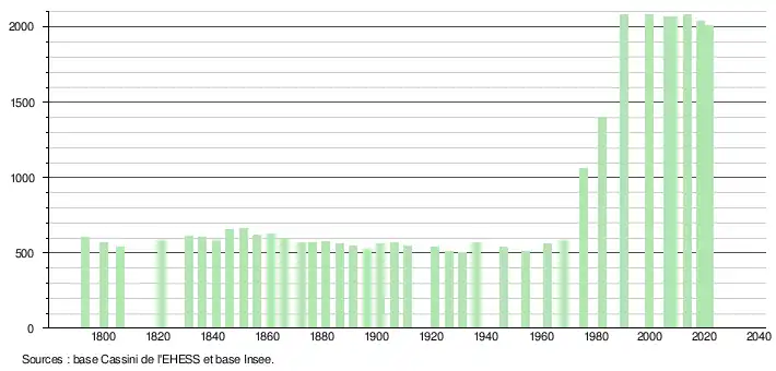 L'évolution du nombre d'habitants est connue à travers les recensements de la population effectués dans la commune depuis 1793. Pour les communes de moins de 10 000 habitants, une enquête de recensement portant sur toute la population est réalisée tous les cinq ans, les populations légales des années intermédiaires étant quant à elles estimées par interpolation ou extrapolation[30]. Pour la commune, le premier recensement exhaustif entrant dans le cadre du nouveau dispositif a été réalisé en 2008[31].