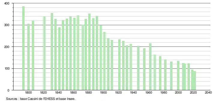 L'évolution du nombre d'habitants est connue à travers les recensements de la population effectués dans la commune depuis 1793. Pour les communes de moins de 10 000 habitants, une enquête de recensement portant sur toute la population est réalisée tous les cinq ans, les populations légales des années intermédiaires étant quant à elles estimées par interpolation ou extrapolation[21]. Pour la commune, le premier recensement exhaustif entrant dans le cadre du nouveau dispositif a été réalisé en 2008[22].