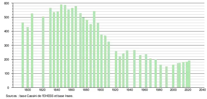 L'évolution du nombre d'habitants est connue à travers les recensements de la population effectués dans la commune depuis 1793. Pour les communes de moins de 10 000 habitants, une enquête de recensement portant sur toute la population est réalisée tous les cinq ans, les populations légales des années intermédiaires étant quant à elles estimées par interpolation ou extrapolation[29]. Pour la commune, le premier recensement exhaustif entrant dans le cadre du nouveau dispositif a été réalisé en 2008[30].