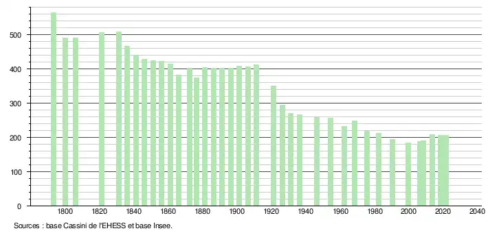 L'évolution du nombre d'habitants est connue à travers les recensements de la population effectués dans la commune depuis 1793. Pour les communes de moins de 10 000 habitants, une enquête de recensement portant sur toute la population est réalisée tous les cinq ans, les populations légales des années intermédiaires étant quant à elles estimées par interpolation ou extrapolation[23]. Pour la commune, le premier recensement exhaustif entrant dans le cadre du nouveau dispositif a été réalisé en 2008[24].