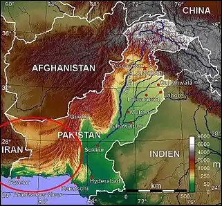 Trois principaux cours d’eau la traverse : le Dasht, le Tomerus ou Hingol[3] et l’Arabis[1] ou Purali[3].