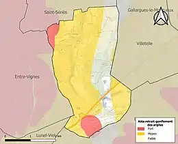 Le retrait-gonflement des sols argileux est susceptible d'engendrer des dommages importants aux bâtiments en cas d’alternance de périodes de sécheresse et de pluie. 73,4 % de la superficie communale est en aléa moyen ou fort (59,3 % au niveau départemental et 48,5 % au niveau national). Sur les 356 bâtiments dénombrés sur la commune en 2019, 356 sont en aléa moyen ou fort, soit 100 %, à comparer aux 85 % au niveau départemental et 54 % au niveau national. Une cartographie de l'exposition du territoire national au retrait gonflement des sols argileux est disponible sur le site du BRGM[25],[Carte 2].