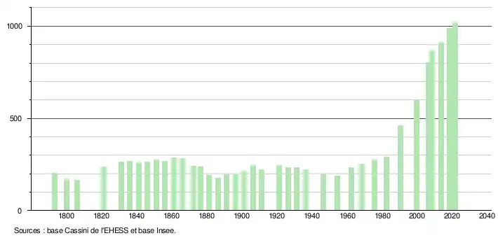- 990 en 2017 selon l’Insee (https://www.insee.fr/fr/statistiques/4269674?geo=COM-34294), nombre qui ne tient pas compte du nouveau lotissement installé et habité depuis cette année 2017.
