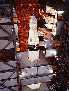 Saturn V, dit Saturn 5, est un lanceur spatial super lourd de la famille Saturn, développé dans les années 1960 par l'agence spatiale américaine, la NASA, pour le programme lunaire Apollo. Utilisé entre 1967 et 1973, il a placé en orbite terrestre, sans aucun échec[Note 1], les vaisseaux qui ont déposé les astronautes américains sur le sol lunaire. Cette énorme fusée d'un peu plus de 3 000 tonnes — détenant toujours, en 2024, les records de masse et de capacité d'emport — est capable de placer jusqu'à 140 tonnes en orbite basse terrestre pour les dernières missions Apollo. Elle est développée dans le contexte de la course à l'espace opposant Américains et Soviétiques dans les années 1960. Ces circonstances permettent aux États-Unis de mobiliser des moyens financiers et humains exceptionnels pour permettre sa mise au point. La fin prématurée du programme Apollo et les restrictions budgétaires entraînent l'arrêt de la chaîne de fabrication de ce lanceur particulièrement coûteux. Après un dernier vol pour mettre en orbite la station spatiale Skylab, la NASA décide de développer un lanceur réutilisable, la navette spatiale américaine, en espérant abaisser sensiblement les coûts très élevés de mise en orbite.