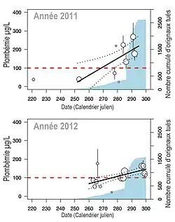 À titre de rappel ou comparaison, chez l'humain, le seuil légal de danger ou quantité maximale tolérée est en France de 50 µg de plomb par litre de sang[59], mais des auteurs estiment que des effets sur le cerveau et la cognition apparaissent avant ce taux ou quelle que soit la dose. L'individu jeune et plus encore le fœtus et l'embryon y sont beaucoup plus sensibles que l'adulte.