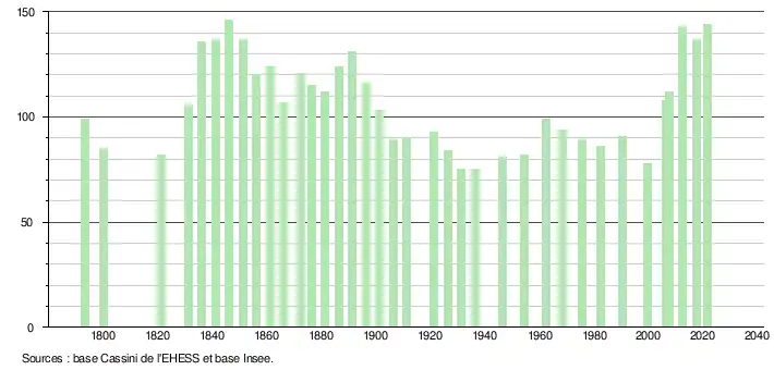 L'évolution du nombre d'habitants est connue à travers les recensements de la population effectués dans la commune depuis 1793. Pour les communes de moins de 10 000 habitants, une enquête de recensement portant sur toute la population est réalisée tous les cinq ans, les populations légales des années intermédiaires étant quant à elles estimées par interpolation ou extrapolation[37]. Pour la commune, le premier recensement exhaustif entrant dans le cadre du nouveau dispositif a été réalisé en 2007[38].