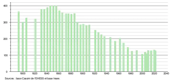 L'évolution du nombre d'habitants est connue à travers les recensements de la population effectués dans la commune depuis 1793. Pour les communes de moins de 10 000 habitants, une enquête de recensement portant sur toute la population est réalisée tous les cinq ans, les populations légales des années intermédiaires étant quant à elles estimées par interpolation ou extrapolation[44]. Pour la commune, le premier recensement exhaustif entrant dans le cadre du nouveau dispositif a été réalisé en 2004[45].