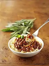 La sauce bolognaise (italien : ragù bolognese, prononcé : [raˈɡu boloɲˈɲeːze] ou ragù alla bolognese) est une recette de sauce traditionnelle de la cuisine italienne, originaire de Bologne en Émilie-Romagne, à base de bœuf haché, sauce tomate, oignon, céleri, carottes, et d'huile d'olive. À Bologne, elle est surtout utilisée avec des tagliatelles[1], lasagnes, cannellonis, pâtes au four, ou polenta, ainsi que pour des pâtes (en particulier des spaghettis) dans le reste du monde[2].