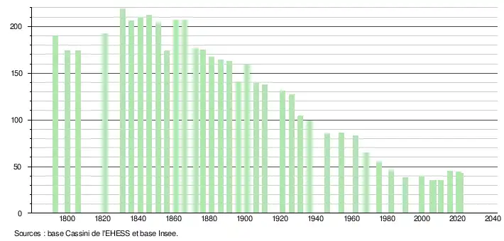 L'évolution du nombre d'habitants est connue à travers les recensements de la population effectués dans la commune depuis 1793. Pour les communes de moins de 10 000 habitants, une enquête de recensement portant sur toute la population est réalisée tous les cinq ans, les populations légales des années intermédiaires étant quant à elles estimées par interpolation ou extrapolation[14]. Pour la commune, le premier recensement exhaustif entrant dans le cadre du nouveau dispositif a été réalisé en 2005[15].