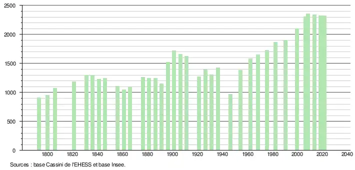 L'évolution du nombre d'habitants est connue à travers les recensements de la population effectués dans la commune depuis 1793. Pour les communes de moins de 10 000 habitants, une enquête de recensement portant sur toute la population est réalisée tous les cinq ans, les populations légales des années intermédiaires étant quant à elles estimées par interpolation ou extrapolation[23]. Pour la commune, le premier recensement exhaustif entrant dans le cadre du nouveau dispositif a été réalisé en 2008[24].