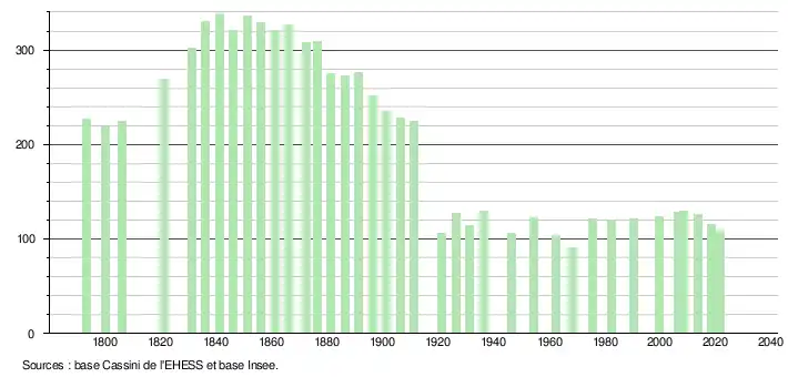 L'évolution du nombre d'habitants est connue à travers les recensements de la population effectués dans la commune depuis 1793. Pour les communes de moins de 10 000 habitants, une enquête de recensement portant sur toute la population est réalisée tous les cinq ans, les populations légales des années intermédiaires étant quant à elles estimées par interpolation ou extrapolation[17]. Pour la commune, le premier recensement exhaustif entrant dans le cadre du nouveau dispositif a été réalisé en 2008[18].