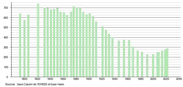 L'évolution du nombre d'habitants est connue à travers les recensements de la population effectués dans la commune depuis 1793. Pour les communes de moins de 10 000 habitants, une enquête de recensement portant sur toute la population est réalisée tous les cinq ans, les populations légales des années intermédiaires étant quant à elles estimées par interpolation ou extrapolation[22]. Pour la commune, le premier recensement exhaustif entrant dans le cadre du nouveau dispositif a été réalisé en 2008[23].