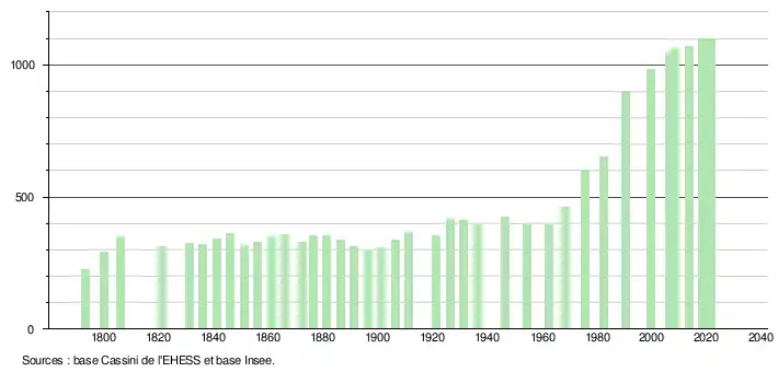 L'évolution du nombre d'habitants est connue à travers les recensements de la population effectués dans la commune depuis 1793. Pour les communes de moins de 10 000 habitants, une enquête de recensement portant sur toute la population est réalisée tous les cinq ans, les populations légales des années intermédiaires étant quant à elles estimées par interpolation ou extrapolation[26]. Pour la commune, le premier recensement exhaustif entrant dans le cadre du nouveau dispositif a été réalisé en 2008[27].