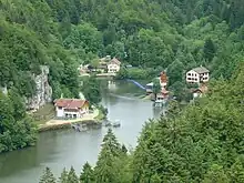 - En bateau-mouche à la belle saison : au départ de Villers-le-Lac[5] ou des Brenets[6], grâce à une croisière commentée au cœur des gorges du Doubs comprenant une escale au bout du lac des Brenets avec accès aux belvédères (600 m de marche).