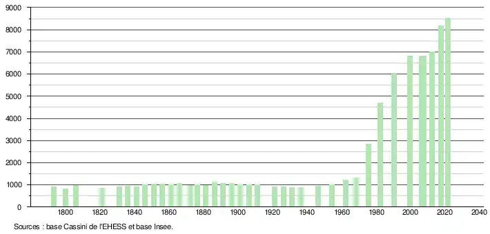 L'évolution du nombre d'habitants est connue à travers les recensements de la population effectués dans la commune depuis 1793. Pour les communes de moins de 10 000 habitants, une enquête de recensement portant sur toute la population est réalisée tous les cinq ans, les populations légales des années intermédiaires étant quant à elles estimées par interpolation ou extrapolation[25]. Pour la commune, le premier recensement exhaustif entrant dans le cadre du nouveau dispositif a été réalisé en 2007[26].