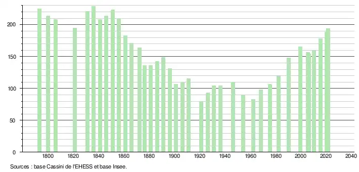 L'évolution du nombre d'habitants est connue à travers les recensements de la population effectués dans la commune depuis 1793. Pour les communes de moins de 10 000 habitants, une enquête de recensement portant sur toute la population est réalisée tous les cinq ans, les populations légales des années intermédiaires étant quant à elles estimées par interpolation ou extrapolation[19]. Pour la commune, le premier recensement exhaustif entrant dans le cadre du nouveau dispositif a été réalisé en 2005[20].