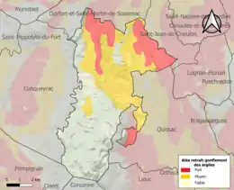 Le retrait-gonflement des sols argileux est susceptible d'engendrer des dommages importants aux bâtiments en cas d’alternance de périodes de sécheresse et de pluie. 52,5 % de la superficie communale est en aléa moyen ou fort (67,5 % au niveau départemental et 48,5 % au niveau national). Sur les 816 bâtiments dénombrés sur la commune en 2019, 719 sont en aléa moyen ou fort, soit 88 %, à comparer aux 90 % au niveau départemental et 54 % au niveau national. Une cartographie de l'exposition du territoire national au retrait gonflement des sols argileux est disponible sur le site du BRGM[19],[Carte 2].