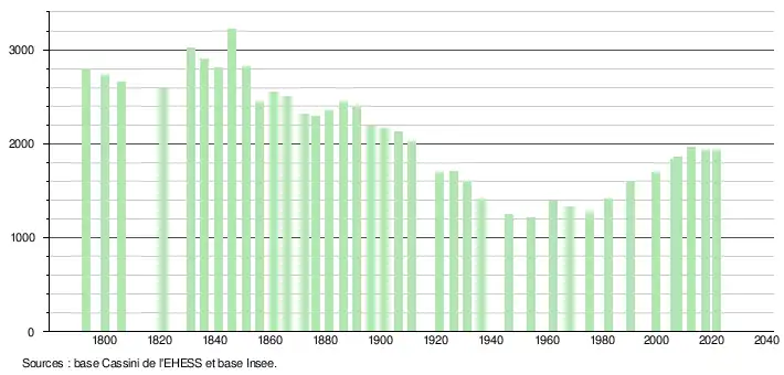L'évolution du nombre d'habitants est connue à travers les recensements de la population effectués dans la commune depuis 1793. Pour les communes de moins de 10 000 habitants, une enquête de recensement portant sur toute la population est réalisée tous les cinq ans, les populations légales des années intermédiaires étant quant à elles estimées par interpolation ou extrapolation[30]. Pour la commune, le premier recensement exhaustif entrant dans le cadre du nouveau dispositif a été réalisé en 2007[31].