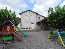 - Le château de Saint-Denis : Le château de Saint-Denis, dans sa forme actuelle, est une chartreuse édifiée au cours du XIXe siècle. Elle s'inspire très précisément d'une précédente chartreuse du XVIIIe siècle, ayant dû être abandonnée par ses occupants. Cette dernière se situait en effet à quelques dizaines de mètres du site actuel, mais à un niveau plus bas, ce qui la rendait vulnérable aux crues de la Garonne toute proche. Le bâtiment se présente sous la forme d’un corps de logis central à un niveau couvert par une toiture à la Mansart, percée de mansardes, encadré par deux pavillons à deux niveaux. Les communs, qui comprennent une orangerie, sont organisés sur une cour en U ouverte à l’ouest. Ils sont antérieurs à la reconstruction du château. Le parc se développe principalement au sud-ouest du château, mais il comprend une pelouse dégagée au nord et il s’étire à l’ouest vers le village sous forme d’un triangle. C’est dans cet angle nord-ouest, en bord de route que se trouve l’entrée principale, soulignée par une demi-lune de bornes en pierre qui encadre l’extrémité d’une allée courbe[33]. Le domaine de Saint Denis appartient à la famille de Bastard, originaire du comté Nantais, qui s'établit dès le XVe siècle en Gascogne, près de Fleurance. La Ségneurie Saint Denis fut acquise par Dominique de Bastard en 1667[34].