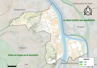 L’inventaire des zones naturelles d'intérêt écologique, faunistique et floristique (ZNIEFF) a pour objectif de réaliser une couverture des zones les plus intéressantes sur le plan écologique, essentiellement dans la perspective d’améliorer la connaissance du patrimoine naturel national et de fournir aux différents décideurs un outil d’aide à la prise en compte de l’environnement dans l’aménagement du territoire. Une ZNIEFF de type 1[Note 2] est recensée sur la commune[10] : « le Vieux Rhône des Arméniers » (140 ha), couvrant 3 communes dont 1 dans le Gard et 2 dans le Vaucluse[11] et deux ZNIEFF de type 2[Note 3],[10] :
