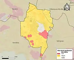 Le retrait-gonflement des sols argileux est susceptible d'engendrer des dommages importants aux bâtiments en cas d’alternance de périodes de sécheresse et de pluie. 94,5 % de la superficie communale est en aléa moyen ou fort (59,3 % au niveau départemental et 48,5 % au niveau national). Sur les 2 249 bâtiments dénombrés sur la commune en 2019, 1 576 sont en aléa moyen ou fort, soit 70 %, à comparer aux 85 % au niveau départemental et 54 % au niveau national. Une cartographie de l'exposition du territoire national au retrait gonflement des sols argileux est disponible sur le site du BRGM[22],[Carte 2].