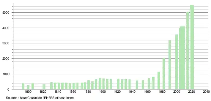 L'évolution du nombre d'habitants est connue à travers les recensements de la population effectués dans la commune depuis 1793. Pour les communes de moins de 10 000 habitants, une enquête de recensement portant sur toute la population est réalisée tous les cinq ans, les populations légales des années intermédiaires étant quant à elles estimées par interpolation ou extrapolation[34]. Pour la commune, le premier recensement exhaustif entrant dans le cadre du nouveau dispositif a été réalisé en 2004[35].