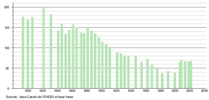 L'évolution du nombre d'habitants est connue à travers les recensements de la population effectués dans la commune depuis 1793. Pour les communes de moins de 10 000 habitants, une enquête de recensement portant sur toute la population est réalisée tous les cinq ans, les populations légales des années intermédiaires étant quant à elles estimées par interpolation ou extrapolation[27]. Pour la commune, le premier recensement exhaustif entrant dans le cadre du nouveau dispositif a été réalisé en 2008[28].