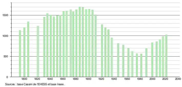 | L'évolution du nombre d'habitants est connue à travers les recensements de la population effectués dans la commune depuis 1793. Pour les communes de moins de 10 000 habitants, une enquête de recensement portant sur toute la population est réalisée tous les cinq ans, les populations légales des années intermédiaires étant quant à elles estimées par interpolation ou extrapolation[22]. Pour la commune, le premier recensement exhaustif entrant dans le cadre du nouveau dispositif a été réalisé en 2006[23]. En 2021, la commune comptait 1 027 habitants[Note 2], en augmentation de 7,31 % par rapport à 2015 (Morbihan : +3,21 %, France hors Mayotte : +1,84 %). |