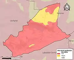 Le retrait-gonflement des sols argileux est susceptible d'engendrer des dommages importants aux bâtiments en cas d’alternance de périodes de sécheresse et de pluie. La totalité de la commune est en aléa moyen ou fort (88,8 % au niveau départemental et 48,5 % au niveau national). Sur les 94 bâtiments dénombrés sur la commune en 2019, 94 sont en aléa moyen ou fort, soit 100 %, à comparer aux 98 % au niveau départemental et 54 % au niveau national. Une cartographie de l'exposition du territoire national au retrait gonflement des sols argileux est disponible sur le site du BRGM[27],[Carte 3].