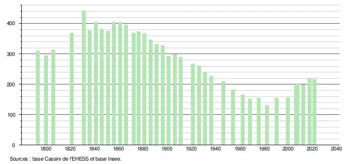 L'évolution du nombre d'habitants est connue à travers les recensements de la population effectués dans la commune depuis 1793. Pour les communes de moins de 10 000 habitants, une enquête de recensement portant sur toute la population est réalisée tous les cinq ans, les populations légales des années intermédiaires étant quant à elles estimées par interpolation ou extrapolation[30]. Pour la commune, le premier recensement exhaustif entrant dans le cadre du nouveau dispositif a été réalisé en 2007[31].