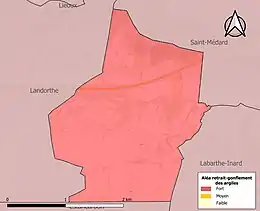 Le retrait-gonflement des sols argileux est susceptible d'engendrer des dommages importants aux bâtiments en cas d’alternance de périodes de sécheresse et de pluie. La totalité de la commune est en aléa moyen ou fort (88,8 % au niveau départemental et 48,5 % au niveau national). Sur les 79 bâtiments dénombrés sur la commune en 2019, 79 sont en aléa moyen ou fort, soit 100 %, à comparer aux 98 % au niveau départemental et 54 % au niveau national. Une cartographie de l'exposition du territoire national au retrait gonflement des sols argileux est disponible sur le site du BRGM[24],[Carte 3].