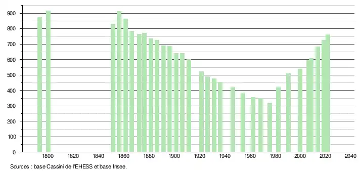 L'évolution du nombre d'habitants est connue à travers les recensements de la population effectués dans la commune depuis 1793. Pour les communes de moins de 10 000 habitants, une enquête de recensement portant sur toute la population est réalisée tous les cinq ans, les populations légales des années intermédiaires étant quant à elles estimées par interpolation ou extrapolation[44]. Pour la commune, le premier recensement exhaustif entrant dans le cadre du nouveau dispositif a été réalisé en 2008[45].