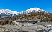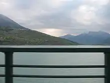Savines et le lac de Serre-Ponçon vus depuis le pic de Morgon (le village est au bout du pont, à droite). | |||||
