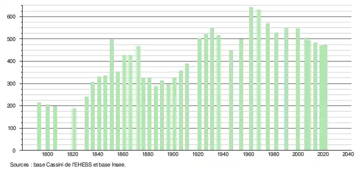 L'évolution du nombre d'habitants est connue à travers les recensements de la population effectués dans la commune depuis 1793. Pour les communes de moins de 10 000 habitants, une enquête de recensement portant sur toute la population est réalisée tous les cinq ans, les populations légales des années intermédiaires étant quant à elles estimées par interpolation ou extrapolation[19]. Pour la commune, le premier recensement exhaustif entrant dans le cadre du nouveau dispositif a été réalisé en 2008[20].