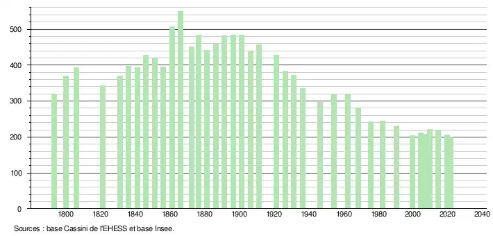 L'évolution du nombre d'habitants est connue à travers les recensements de la population effectués dans la commune depuis 1793. Pour les communes de moins de 10 000 habitants, une enquête de recensement portant sur toute la population est réalisée tous les cinq ans, les populations légales des années intermédiaires étant quant à elles estimées par interpolation ou extrapolation[17]. Pour la commune, le premier recensement exhaustif entrant dans le cadre du nouveau dispositif a été réalisé en 2004[18].