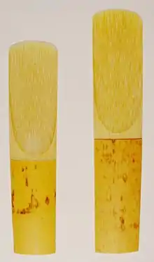 L'anche est généralement en roseau, mais peut aussi être en matière synthétique, ce qui allonge considérablement sa durée de vie, mais diminue la qualité de son. Ce type d'anche est plutôt utilisé au sein d'orchestre afin de ne pas « gâcher » une anche classique, relativement onéreuse[7]. Elle est aussi un facteur déterminant de la qualité du son, selon sa coupe et sa force (flexibilité). L'anche du saxophone est dite une anche simple battante, comme celle de la clarinette. Chaque type de saxophone possède une taille d'anche spécifique.