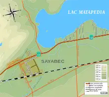 Sayabec est situé sur la rive sud du fleuve Saint-Laurent sur la péninsule gaspésienne dans la vallée de la Matapédia à 375 km au nord-est de Québec, à 350 km à l'ouest de Gaspé et à 100 km au nord du Nouveau-Brunswick. Les principales villes à proximité sont Rimouski à 60 km et Mont-Joli à 30 km à l'ouest, Matane à 40 km au nord ainsi qu'Amqui à 20 km à l'est. La municipalité est limitrophe de Saint-Moïse à l'ouest, de Val-Brillant à l'est, de Saint-Cléophas au sud et de Sainte-Paule au nord. Le village est divisé en deux parties : une partie principale, près du lac Matapédia, et une partie secondaire, près du lac Malcolm, qui forme le hameau du Lac-Malcolm. Sayabec s'étend sur 130 km2 à la pointe nord-ouest du lac Matapédia[6]. Les régions boisées couvrent 47,9 % de cette superficie et l'eau 8,4 %, le reste du territoire étant déboisé (43,7 %) ; quelque 35 % du territoire sayabécois est propice à l'agriculture[6].
